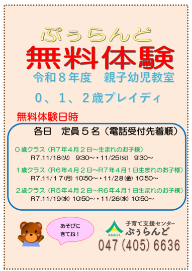 ぷぅらんどの親子教室・プレイディでは、季節や年齢に合った親子体操・製作などを行いながら、ご家族での遊びの世界を広げるお手伝いをさせていただいております。また、お子さまもお母さまのお友達作りの場としても輪を広げていただいております